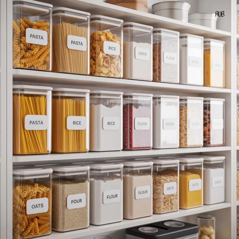 Choose a few consistent storage containers for high-use items such as rice, pasta, flour, cereal, or snacks. Label them clearly. Standardized containers create uniformity. Uniformity improves visibility.