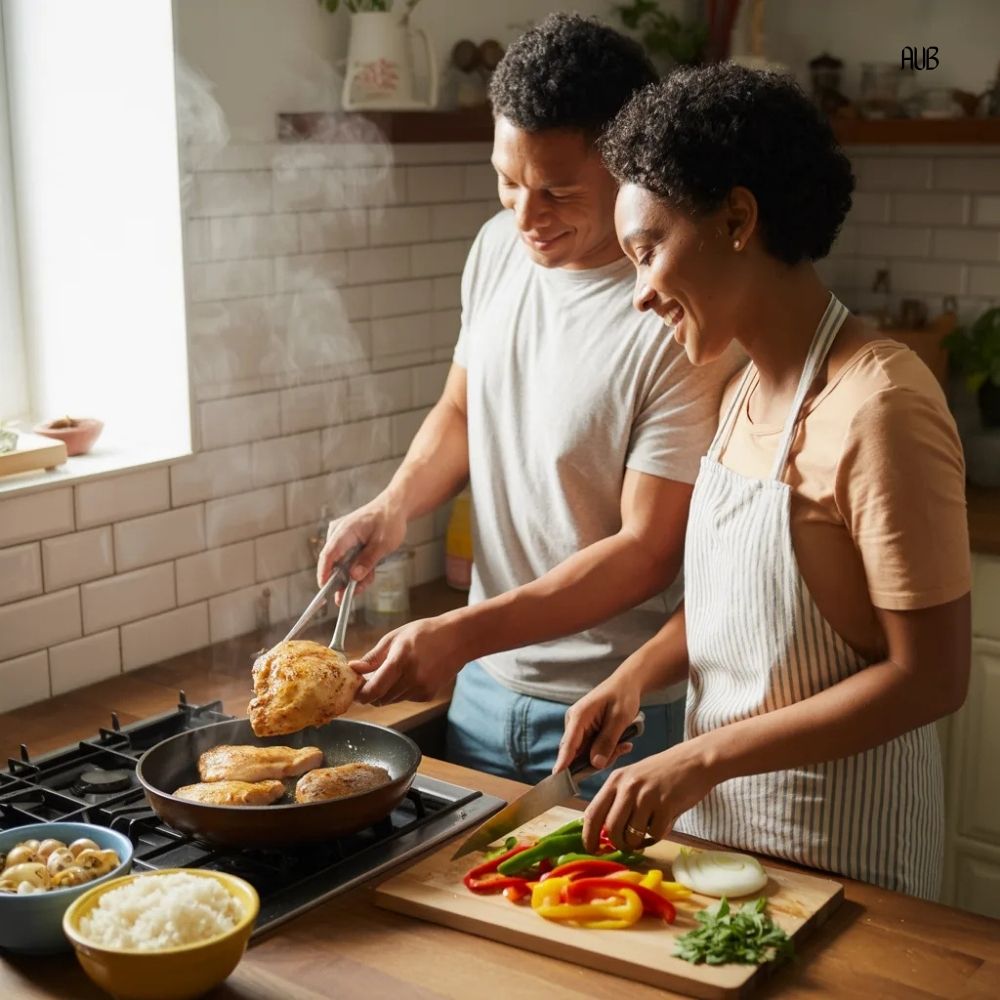 To reduce congestion, assign roles clearly during prep. One partner handles protein preparation. The other manages vegetables and bases.